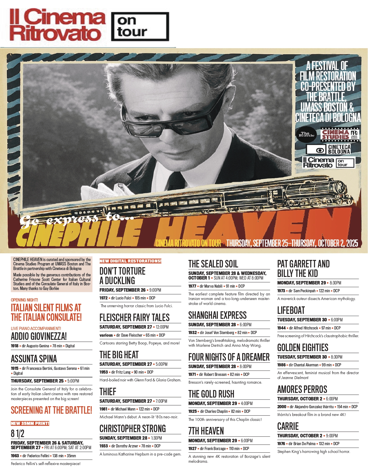 Ogni estate, il sogno di un amante del cinema si realizza a Bologna, in Italia, quando Il Cinema Ritrovato prende il controllo della città. Questo storico festival cinematografico mette in risalto alcuni dei restauri e delle riscoperte cinematografiche più sorprendenti e attira ospiti e cinefili da tutto il mondo. The Brattle è entusiasta di collaborare con i membri del programma Cinema Studies dell’UMASS Boston per portare una versione itinerante di questo festival qui sulle nostre coste impazzite dal cinema.